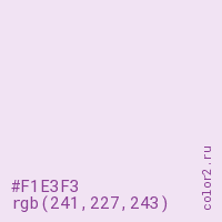 Цвет #F1E3F3 в цветовой модели RGB обозначается тремя октетами (241, 227, 243) в десятичном формате и #F1E3F3 в шестнадцатиричном (hex) формате, которые являются интенсивностью красного 241 (hex F1), интенсивность зелёного 227 (hex E3) и интенсивность синего 243 (hex F3).