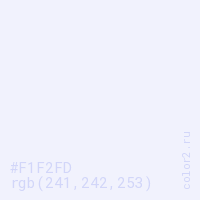 Цвет #F1F2FD в цветовой модели RGB обозначается тремя октетами (241, 242, 253) в десятичном формате и #F1F2FD в шестнадцатиричном (hex) формате, которые являются интенсивностью красного 241 (hex F1), интенсивность зелёного 242 (hex F2) и интенсивность синего 253 (hex FD).