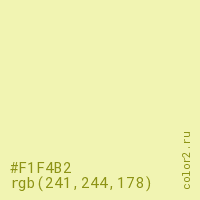 Цвет #F1F4B2 в цветовой модели RGB обозначается тремя октетами (241, 244, 178) в десятичном формате и #F1F4B2 в шестнадцатиричном (hex) формате, которые являются интенсивностью красного 241 (hex F1), интенсивность зелёного 244 (hex F4) и интенсивность синего 178 (hex B2).
