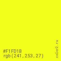 Цвет #F1FD1B в цветовой модели RGB обозначается тремя октетами (241, 253, 27) в десятичном формате и #F1FD1B в шестнадцатиричном (hex) формате, которые являются интенсивностью красного 241 (hex F1), интенсивность зелёного 253 (hex FD) и интенсивность синего 27 (hex 1B).
