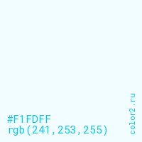 Цвет #F1FDFF в цветовой модели RGB обозначается тремя октетами (241, 253, 255) в десятичном формате и #F1FDFF в шестнадцатиричном (hex) формате, которые являются интенсивностью красного 241 (hex F1), интенсивность зелёного 253 (hex FD) и интенсивность синего 255 (hex FF).
