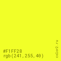 Цвет #F1FF28 в цветовой модели RGB обозначается тремя октетами (241, 255, 40) в десятичном формате и #F1FF28 в шестнадцатиричном (hex) формате, которые являются интенсивностью красного 241 (hex F1), интенсивность зелёного 255 (hex FF) и интенсивность синего 40 (hex 28).