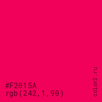 Цвет #F2015A в цветовой модели RGB обозначается тремя октетами (242, 1, 90) в десятичном формате и #F2015A в шестнадцатиричном (hex) формате, которые являются интенсивностью красного 242 (hex F2), интенсивность зелёного 1 (hex 01) и интенсивность синего 90 (hex 5A).