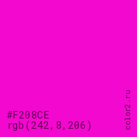 Цвет #F208CE в цветовой модели RGB обозначается тремя октетами (242, 8, 206) в десятичном формате и #F208CE в шестнадцатиричном (hex) формате, которые являются интенсивностью красного 242 (hex F2), интенсивность зелёного 8 (hex 08) и интенсивность синего 206 (hex CE).