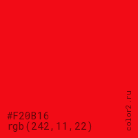 Цвет #F20B16 в цветовой модели RGB обозначается тремя октетами (242, 11, 22) в десятичном формате и #F20B16 в шестнадцатиричном (hex) формате, которые являются интенсивностью красного 242 (hex F2), интенсивность зелёного 11 (hex 0B) и интенсивность синего 22 (hex 16).