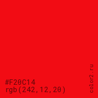 Цвет #F20C14 в цветовой модели RGB обозначается тремя октетами (242, 12, 20) в десятичном формате и #F20C14 в шестнадцатиричном (hex) формате, которые являются интенсивностью красного 242 (hex F2), интенсивность зелёного 12 (hex 0C) и интенсивность синего 20 (hex 14).