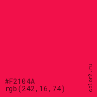 Цвет #F2104A в цветовой модели RGB обозначается тремя октетами (242, 16, 74) в десятичном формате и #F2104A в шестнадцатиричном (hex) формате, которые являются интенсивностью красного 242 (hex F2), интенсивность зелёного 16 (hex 10) и интенсивность синего 74 (hex 4A).