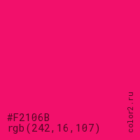 Цвет #F2106B в цветовой модели RGB обозначается тремя октетами (242, 16, 107) в десятичном формате и #F2106B в шестнадцатиричном (hex) формате, которые являются интенсивностью красного 242 (hex F2), интенсивность зелёного 16 (hex 10) и интенсивность синего 107 (hex 6B).
