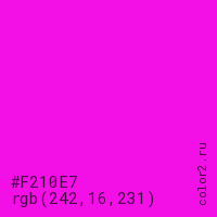 Цвет #F210E7 в цветовой модели RGB обозначается тремя октетами (242, 16, 231) в десятичном формате и #F210E7 в шестнадцатиричном (hex) формате, которые являются интенсивностью красного 242 (hex F2), интенсивность зелёного 16 (hex 10) и интенсивность синего 231 (hex E7).