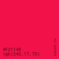 Цвет #F21149 в цветовой модели RGB обозначается тремя октетами (242, 17, 73) в десятичном формате и #F21149 в шестнадцатиричном (hex) формате, которые являются интенсивностью красного 242 (hex F2), интенсивность зелёного 17 (hex 11) и интенсивность синего 73 (hex 49).