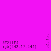 Цвет #F211F4 в цветовой модели RGB обозначается тремя октетами (242, 17, 244) в десятичном формате и #F211F4 в шестнадцатиричном (hex) формате, которые являются интенсивностью красного 242 (hex F2), интенсивность зелёного 17 (hex 11) и интенсивность синего 244 (hex F4).
