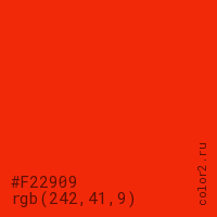 Цвет #F22909 в цветовой модели RGB обозначается тремя октетами (242, 41, 9) в десятичном формате и #F22909 в шестнадцатиричном (hex) формате, которые являются интенсивностью красного 242 (hex F2), интенсивность зелёного 41 (hex 29) и интенсивность синего 9 (hex 09).