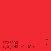Цвет #F22933 в цветовой модели RGB обозначается тремя октетами (242, 41, 51) в десятичном формате и #F22933 в шестнадцатиричном (hex) формате, которые являются интенсивностью красного 242 (hex F2), интенсивность зелёного 41 (hex 29) и интенсивность синего 51 (hex 33).