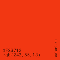 Цвет #F23712 в цветовой модели RGB обозначается тремя октетами (242, 55, 18) в десятичном формате и #F23712 в шестнадцатиричном (hex) формате, которые являются интенсивностью красного 242 (hex F2), интенсивность зелёного 55 (hex 37) и интенсивность синего 18 (hex 12).