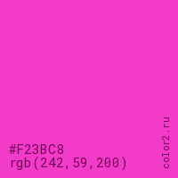 Цвет #F23BC8 в цветовой модели RGB обозначается тремя октетами (242, 59, 200) в десятичном формате и #F23BC8 в шестнадцатиричном (hex) формате, которые являются интенсивностью красного 242 (hex F2), интенсивность зелёного 59 (hex 3B) и интенсивность синего 200 (hex C8).