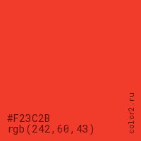 Цвет #F23C2B в цветовой модели RGB обозначается тремя октетами (242, 60, 43) в десятичном формате и #F23C2B в шестнадцатиричном (hex) формате, которые являются интенсивностью красного 242 (hex F2), интенсивность зелёного 60 (hex 3C) и интенсивность синего 43 (hex 2B).