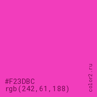 Цвет #F23DBC в цветовой модели RGB обозначается тремя октетами (242, 61, 188) в десятичном формате и #F23DBC в шестнадцатиричном (hex) формате, которые являются интенсивностью красного 242 (hex F2), интенсивность зелёного 61 (hex 3D) и интенсивность синего 188 (hex BC).