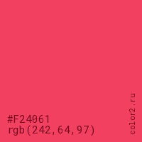 Цвет #F24061 в цветовой модели RGB обозначается тремя октетами (242, 64, 97) в десятичном формате и #F24061 в шестнадцатиричном (hex) формате, которые являются интенсивностью красного 242 (hex F2), интенсивность зелёного 64 (hex 40) и интенсивность синего 97 (hex 61).