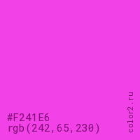 Цвет #F241E6 в цветовой модели RGB обозначается тремя октетами (242, 65, 230) в десятичном формате и #F241E6 в шестнадцатиричном (hex) формате, которые являются интенсивностью красного 242 (hex F2), интенсивность зелёного 65 (hex 41) и интенсивность синего 230 (hex E6).