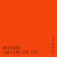 Цвет #F2440D в цветовой модели RGB обозначается тремя октетами (242, 68, 13) в десятичном формате и #F2440D в шестнадцатиричном (hex) формате, которые являются интенсивностью красного 242 (hex F2), интенсивность зелёного 68 (hex 44) и интенсивность синего 13 (hex 0D).