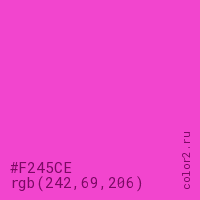 Цвет #F245CE в цветовой модели RGB обозначается тремя октетами (242, 69, 206) в десятичном формате и #F245CE в шестнадцатиричном (hex) формате, которые являются интенсивностью красного 242 (hex F2), интенсивность зелёного 69 (hex 45) и интенсивность синего 206 (hex CE).