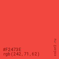 Цвет #F2473E в цветовой модели RGB обозначается тремя октетами (242, 71, 62) в десятичном формате и #F2473E в шестнадцатиричном (hex) формате, которые являются интенсивностью красного 242 (hex F2), интенсивность зелёного 71 (hex 47) и интенсивность синего 62 (hex 3E).
