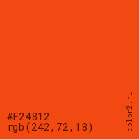 Цвет #F24812 в цветовой модели RGB обозначается тремя октетами (242, 72, 18) в десятичном формате и #F24812 в шестнадцатиричном (hex) формате, которые являются интенсивностью красного 242 (hex F2), интенсивность зелёного 72 (hex 48) и интенсивность синего 18 (hex 12).