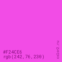 Цвет #F24CE6 в цветовой модели RGB обозначается тремя октетами (242, 76, 230) в десятичном формате и #F24CE6 в шестнадцатиричном (hex) формате, которые являются интенсивностью красного 242 (hex F2), интенсивность зелёного 76 (hex 4C) и интенсивность синего 230 (hex E6).