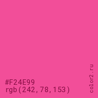 Цвет #F24E99 в цветовой модели RGB обозначается тремя октетами (242, 78, 153) в десятичном формате и #F24E99 в шестнадцатиричном (hex) формате, которые являются интенсивностью красного 242 (hex F2), интенсивность зелёного 78 (hex 4E) и интенсивность синего 153 (hex 99).