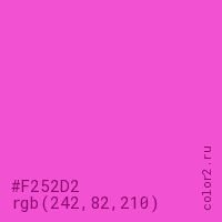 Цвет #F252D2 в цветовой модели RGB обозначается тремя октетами (242, 82, 210) в десятичном формате и #F252D2 в шестнадцатиричном (hex) формате, которые являются интенсивностью красного 242 (hex F2), интенсивность зелёного 82 (hex 52) и интенсивность синего 210 (hex D2).