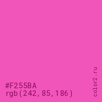 Цвет #F255BA в цветовой модели RGB обозначается тремя октетами (242, 85, 186) в десятичном формате и #F255BA в шестнадцатиричном (hex) формате, которые являются интенсивностью красного 242 (hex F2), интенсивность зелёного 85 (hex 55) и интенсивность синего 186 (hex BA).