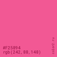 Цвет #F25894 в цветовой модели RGB обозначается тремя октетами (242, 88, 148) в десятичном формате и #F25894 в шестнадцатиричном (hex) формате, которые являются интенсивностью красного 242 (hex F2), интенсивность зелёного 88 (hex 58) и интенсивность синего 148 (hex 94).