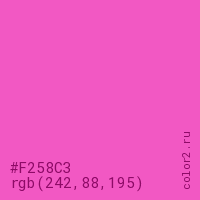 Цвет #F258C3 в цветовой модели RGB обозначается тремя октетами (242, 88, 195) в десятичном формате и #F258C3 в шестнадцатиричном (hex) формате, которые являются интенсивностью красного 242 (hex F2), интенсивность зелёного 88 (hex 58) и интенсивность синего 195 (hex C3).