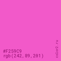 Цвет #F259C9 в цветовой модели RGB обозначается тремя октетами (242, 89, 201) в десятичном формате и #F259C9 в шестнадцатиричном (hex) формате, которые являются интенсивностью красного 242 (hex F2), интенсивность зелёного 89 (hex 59) и интенсивность синего 201 (hex C9).