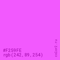Цвет #F259FE в цветовой модели RGB обозначается тремя октетами (242, 89, 254) в десятичном формате и #F259FE в шестнадцатиричном (hex) формате, которые являются интенсивностью красного 242 (hex F2), интенсивность зелёного 89 (hex 59) и интенсивность синего 254 (hex FE).