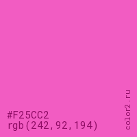 Цвет #F25CC2 в цветовой модели RGB обозначается тремя октетами (242, 92, 194) в десятичном формате и #F25CC2 в шестнадцатиричном (hex) формате, которые являются интенсивностью красного 242 (hex F2), интенсивность зелёного 92 (hex 5C) и интенсивность синего 194 (hex C2).