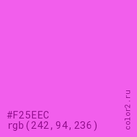 Цвет #F25EEC в цветовой модели RGB обозначается тремя октетами (242, 94, 236) в десятичном формате и #F25EEC в шестнадцатиричном (hex) формате, которые являются интенсивностью красного 242 (hex F2), интенсивность зелёного 94 (hex 5E) и интенсивность синего 236 (hex EC).