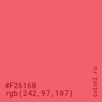 Цвет #F2616B в цветовой модели RGB обозначается тремя октетами (242, 97, 107) в десятичном формате и #F2616B в шестнадцатиричном (hex) формате, которые являются интенсивностью красного 242 (hex F2), интенсивность зелёного 97 (hex 61) и интенсивность синего 107 (hex 6B).