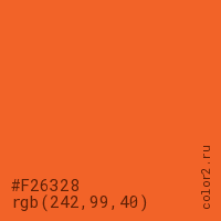 Цвет #F26328 в цветовой модели RGB обозначается тремя октетами (242, 99, 40) в десятичном формате и #F26328 в шестнадцатиричном (hex) формате, которые являются интенсивностью красного 242 (hex F2), интенсивность зелёного 99 (hex 63) и интенсивность синего 40 (hex 28).