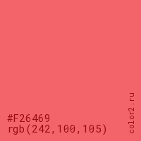 Цвет #F26469 в цветовой модели RGB обозначается тремя октетами (242, 100, 105) в десятичном формате и #F26469 в шестнадцатиричном (hex) формате, которые являются интенсивностью красного 242 (hex F2), интенсивность зелёного 100 (hex 64) и интенсивность синего 105 (hex 69).