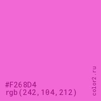 Цвет #F268D4 в цветовой модели RGB обозначается тремя октетами (242, 104, 212) в десятичном формате и #F268D4 в шестнадцатиричном (hex) формате, которые являются интенсивностью красного 242 (hex F2), интенсивность зелёного 104 (hex 68) и интенсивность синего 212 (hex D4).