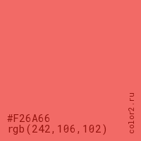 Цвет #F26A66 в цветовой модели RGB обозначается тремя октетами (242, 106, 102) в десятичном формате и #F26A66 в шестнадцатиричном (hex) формате, которые являются интенсивностью красного 242 (hex F2), интенсивность зелёного 106 (hex 6A) и интенсивность синего 102 (hex 66).
