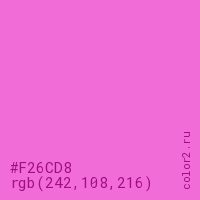 Цвет #F26CD8 в цветовой модели RGB обозначается тремя октетами (242, 108, 216) в десятичном формате и #F26CD8 в шестнадцатиричном (hex) формате, которые являются интенсивностью красного 242 (hex F2), интенсивность зелёного 108 (hex 6C) и интенсивность синего 216 (hex D8).