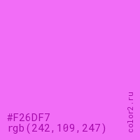 Цвет #F26DF7 в цветовой модели RGB обозначается тремя октетами (242, 109, 247) в десятичном формате и #F26DF7 в шестнадцатиричном (hex) формате, которые являются интенсивностью красного 242 (hex F2), интенсивность зелёного 109 (hex 6D) и интенсивность синего 247 (hex F7).