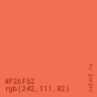 Цвет #F26F52 в цветовой модели RGB обозначается тремя октетами (242, 111, 82) в десятичном формате и #F26F52 в шестнадцатиричном (hex) формате, которые являются интенсивностью красного 242 (hex F2), интенсивность зелёного 111 (hex 6F) и интенсивность синего 82 (hex 52).