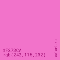 Цвет #F273CA в цветовой модели RGB обозначается тремя октетами (242, 115, 202) в десятичном формате и #F273CA в шестнадцатиричном (hex) формате, которые являются интенсивностью красного 242 (hex F2), интенсивность зелёного 115 (hex 73) и интенсивность синего 202 (hex CA).