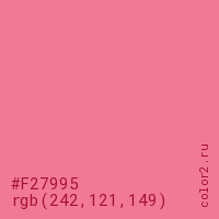 Цвет #F27995 в цветовой модели RGB обозначается тремя октетами (242, 121, 149) в десятичном формате и #F27995 в шестнадцатиричном (hex) формате, которые являются интенсивностью красного 242 (hex F2), интенсивность зелёного 121 (hex 79) и интенсивность синего 149 (hex 95).