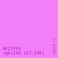 Цвет #F27FF9 в цветовой модели RGB обозначается тремя октетами (242, 127, 249) в десятичном формате и #F27FF9 в шестнадцатиричном (hex) формате, которые являются интенсивностью красного 242 (hex F2), интенсивность зелёного 127 (hex 7F) и интенсивность синего 249 (hex F9).
