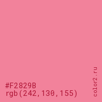 Цвет RGB(242, 130, 155) в процентом отношении количества цвета состоит из 94.9% красного (red), 51% зелёного (green) и 60.8% синего (blue).