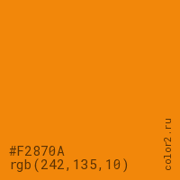 Цвет #F2870A в цветовой модели RGB обозначается тремя октетами (242, 135, 10) в десятичном формате и #F2870A в шестнадцатиричном (hex) формате, которые являются интенсивностью красного 242 (hex F2), интенсивность зелёного 135 (hex 87) и интенсивность синего 10 (hex 0A).
